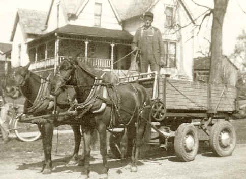 Aaron Bray with "Barney and Babe" pulling ice wagon