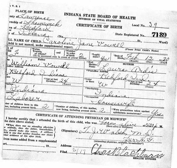Birth Certificate - Carolyn J Vowell