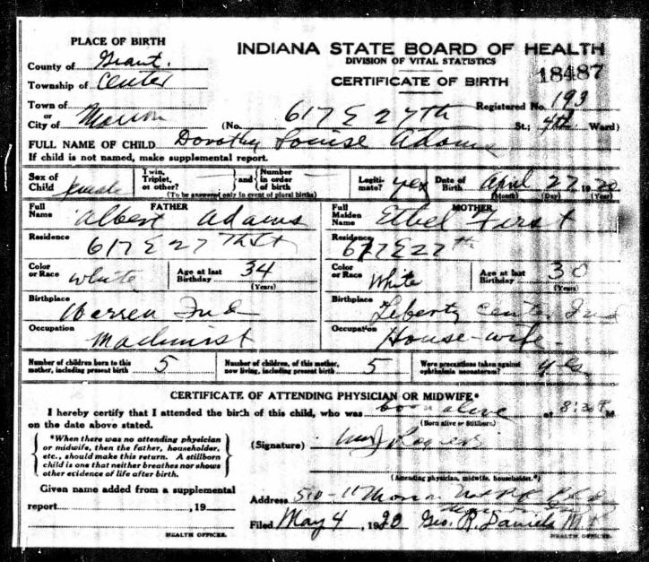 Birth Certificate - Dorothy Louise Adams