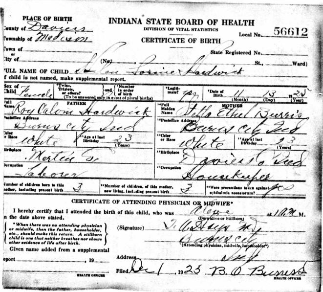 Birth Certificate - Helen Lorene Hardwick