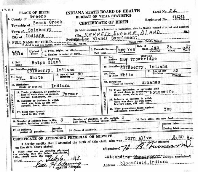 Birth Certificate - Ralph Eugene Bland