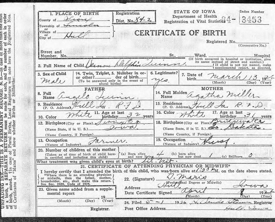 Birth Certificate - Vernon Delphin Quinn