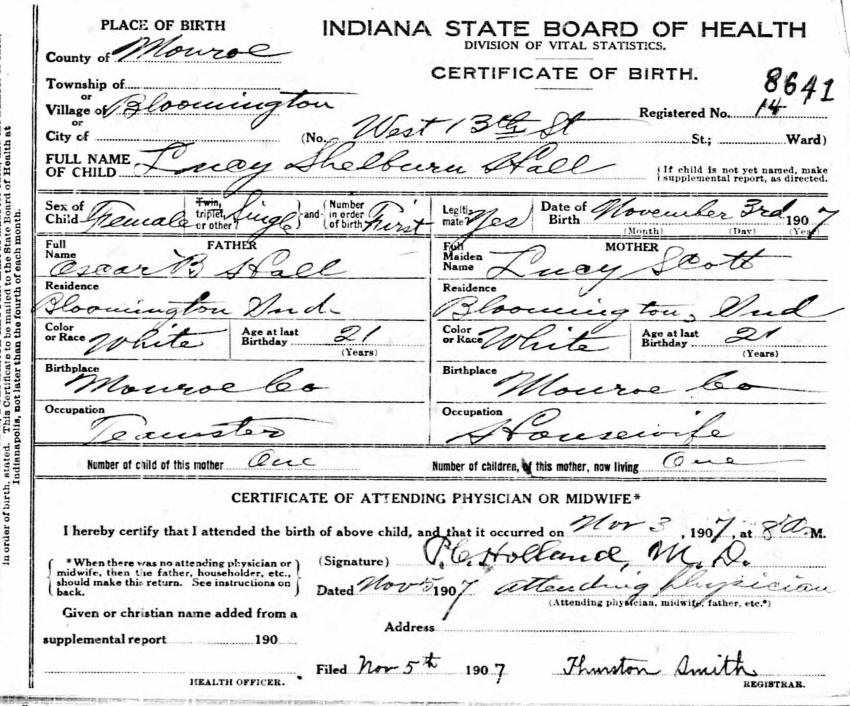 Birth Certificate - Shelbern Lucy Hall