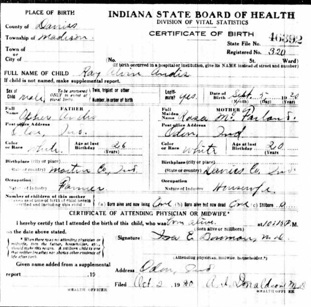 Birth Certificate - Ray Alvin Andis