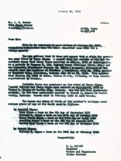 | SIPES, Henry WC-217,275 January 30, 1936 Mr C H Hunter Dear Sirs: This is in reference to your letter of January 10, 1936, requesting information from the above described case file for a family record. You are advised that it does not appear that a claim for pension was ever filed by Henry Sipes. A report from the records of the War Department shows that Henry Sipes enlisted on July 6, 1861 at Indianapolis, as a private in Company F, 1st Indiana Heavy Artillery (21st Inf.) and was honorably discharged January 10, 1865, a corporal. Prisoner of War records show him captured at Brashear, Louisiana, June 23, 1863; paroled at Brashear City, Louisiana, between June 24 or 29, 1863. This soldier died January 19, 1883 at Salem, Marion County, Illinois, of lung trouble, superinduced by measles. Isabelle Sipes was pensioned as the widow of Henry Sipes. Isabell Webster and Henry Sipes were married on December 1, 1870 by Thomas C. Phipps at Martin City, Indiana. She had not been previously married. He had been previously married to Hannah A. Bowman in Martin County, Indiana. Hannah died in February 1870 in said county. The names and dates of birth of the soldier's children under sixteen years of age at his death were as follows: By Isabell Sipes: Dora Sipes - born on the 6th day of