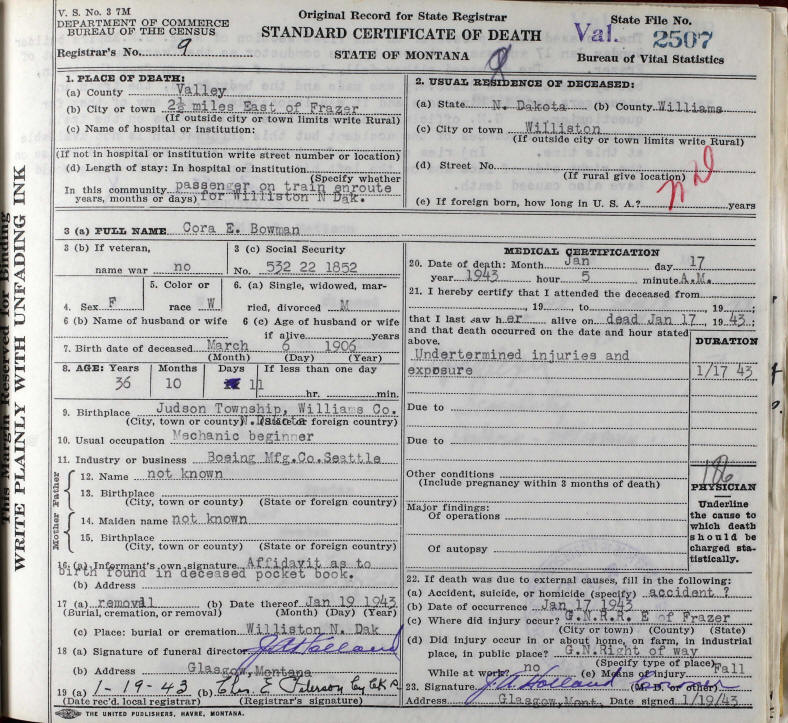 Death Certificate - Cora Ethel (Rhodes) Bowman