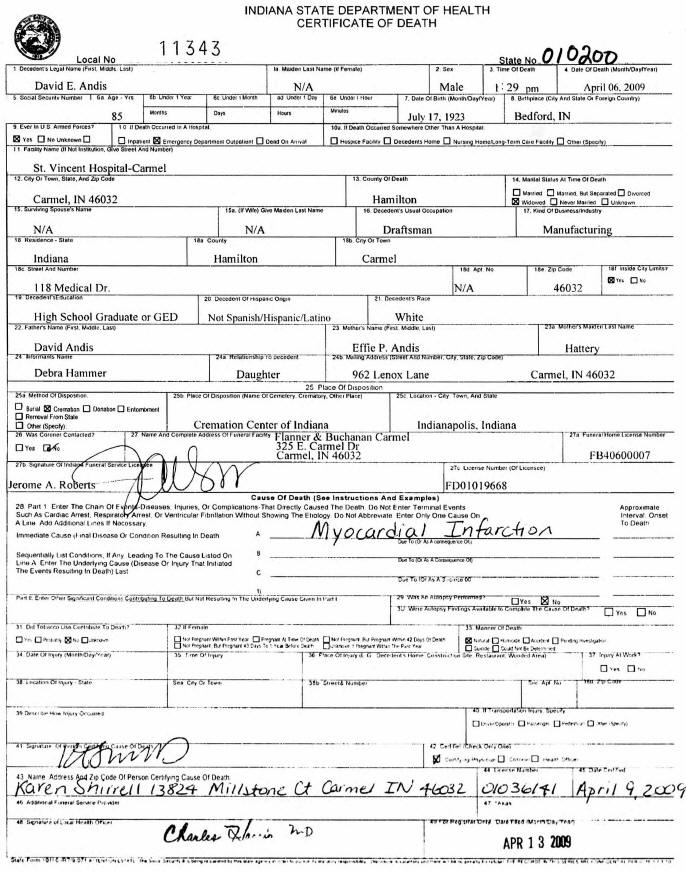Death Certificate - David Eugene Andis