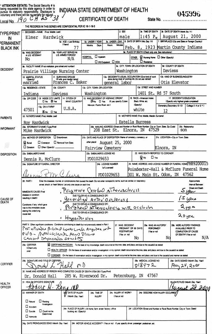 Death Certificate - Elmer Clint Hardwick
