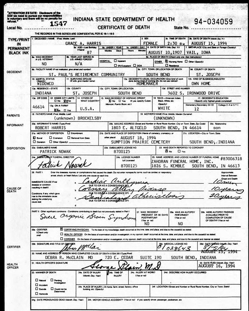 Death Certificate - Grace (Brockelsby) Harris