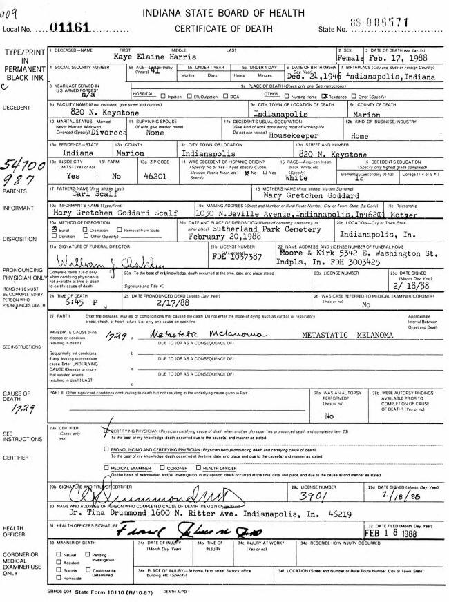 Death Certificate - Kaye Elaine (Scalf) Harris