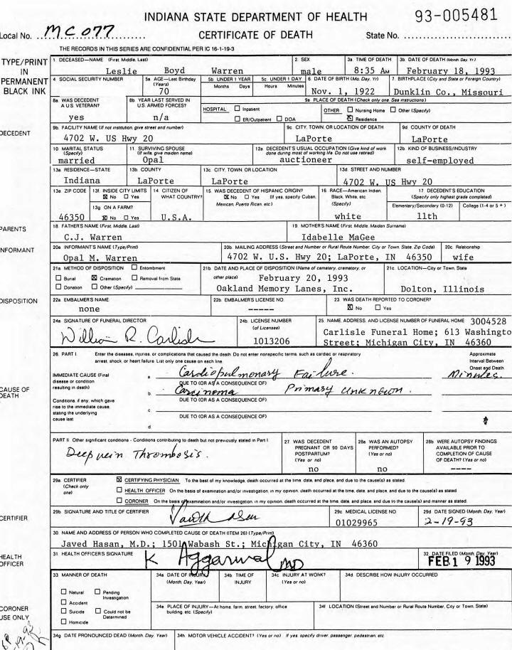 Death Certificate - Leslie Boyd Warren