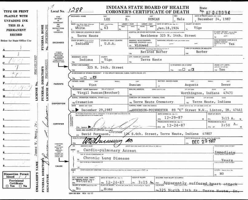 Death Certificate - Lex Elmo Duncan