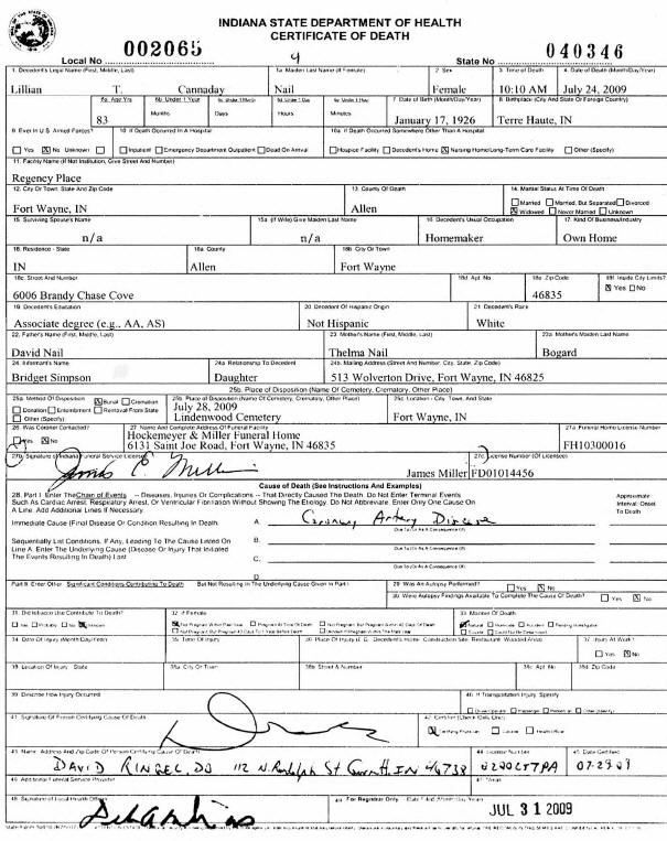 Death Certificate - Lillian Thelma (Nail) Cannaday