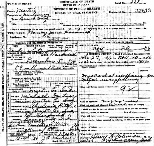 Death Certificate - Nancy (Fortner) Hardwick