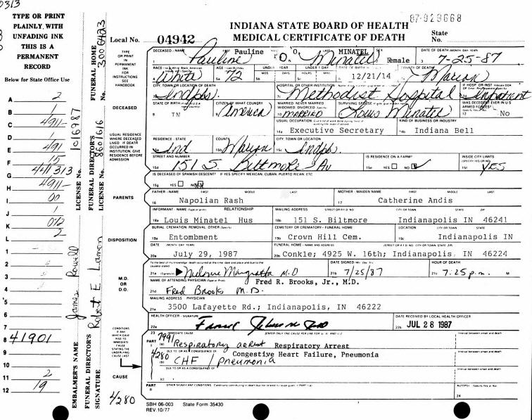 Death Certificate - Pauline Olive (Rash) Minatel