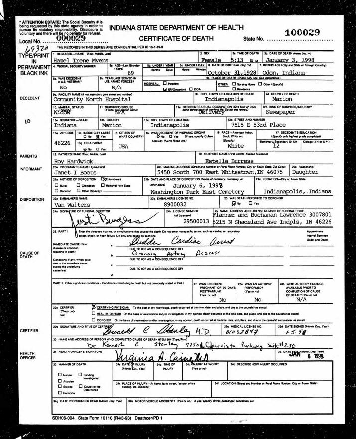 Death Certificate - Hazel (Hardwick) Myers