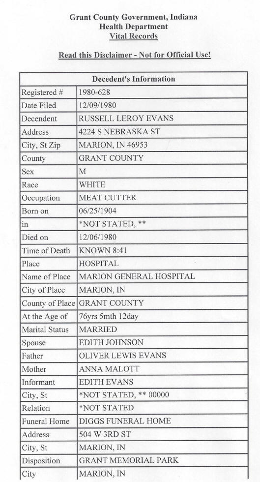 Death Record - Russell Leroy Evans