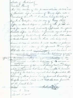 In the matter of the pension claim No. 306.442 of Isabelle Sipes as widow of Henry Sipes late a member of Co F 1st Indiana heavy Artilery 21 Reg Ind Vols. On this day 20 day of May 1885 before me David D Gore a justice of the peace in and for said county personally appeared the aforesaid Isabelle Sipes the claimant aforesaid aged 38 years a resident of Martin County Indiana whose P.O. address is Keck's Church Martin Co Ind who being duly sworn declare in relation to said matter as follows: that she is the widow of aforesaid Henry Sipes that she has made diligent enquiry and has used all the means in her power to obtain the testimony of commisioned officers of the soldier's company having personal knowledge of the facts required and also the testimony of the surgeon or assistant surgeon of his regiment showing treatment therefore while in the service but have been unable to furnish any part of the testimony required but has furnished the testimony of other persons having personal knowledge of the facts required which is all that she can furnish at the present time. Witnesses Ida F Gore and Sarah B Gore Isabelle Sipes (her mark) |
