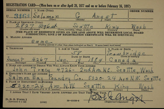 WWI and WWII Draft Cards - Solomon G Angst