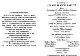 Funeral Card - Jeanne Frances (Kegin) Barlow