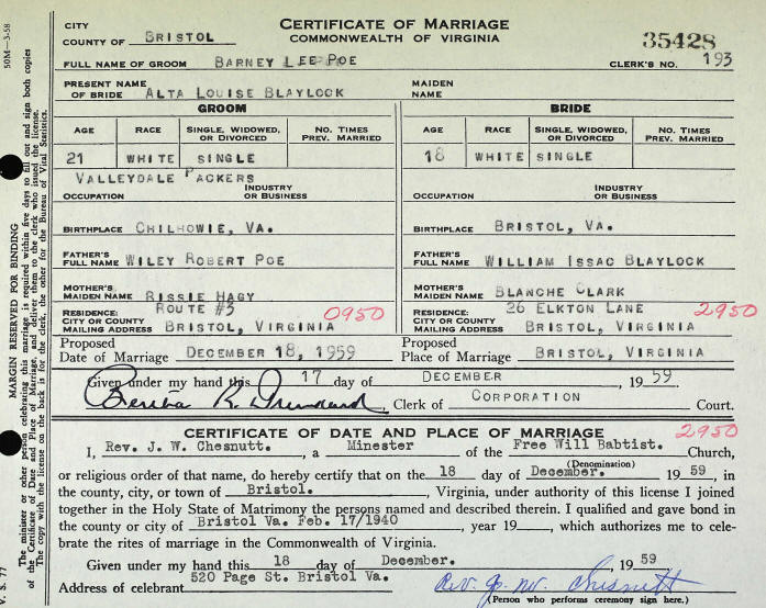 Marriage - Blaylock and Poe