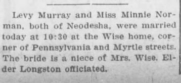 "Kansas Marriages, 1840-1935," database, FamilySearch(https://familysearch.org/ark:/61903/1:1:FW2R-YXC : accessed 13 September 2015), Levy Murray and Minnie Norman, 11 Aug 1909; citing Independence, Montgomery, Kansas, reference v0p268; FHL microfilm 1,404,635.