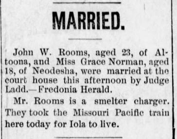 "Kansas Marriages, 1840-1935," database, FamilySearch(https://familysearch.org/ark:/61903/1:1:FW2X-HW1 : accessed 13 September 2015), John W. Rooms and Grace Norman, 24 May 1905; citing Fredonia, Wilson, Kansas, reference pg311; FHL microfilm 1,428,565.