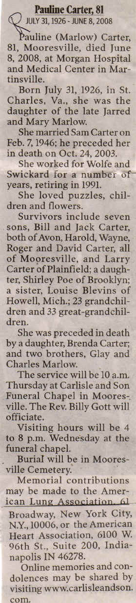 Obituary - Pauline "Mattie" (Marlow) Carter