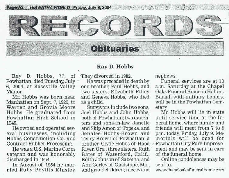 Ray D. Hobbs, 77, Powhattan, died July 6, 2004, at a Rossville care center. He was born Sept. 7, 1926, near Powhattan, the son of Warren C. and Grovia Moore Hobbs. He graduated from Powhattan High School in 1945.