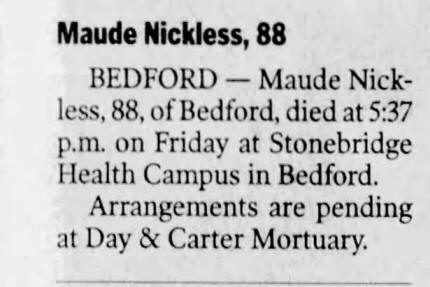 Maude Edith Nickless, 88, of Bedford and formerly of Mitchell, passed away